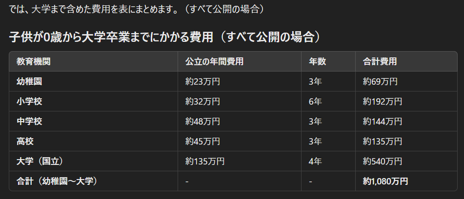そう思ってチャットGPTに大学も含めた学費を試算してもらったところ、少し足は出るが1080万になった。ちなみに公立の場合だ。